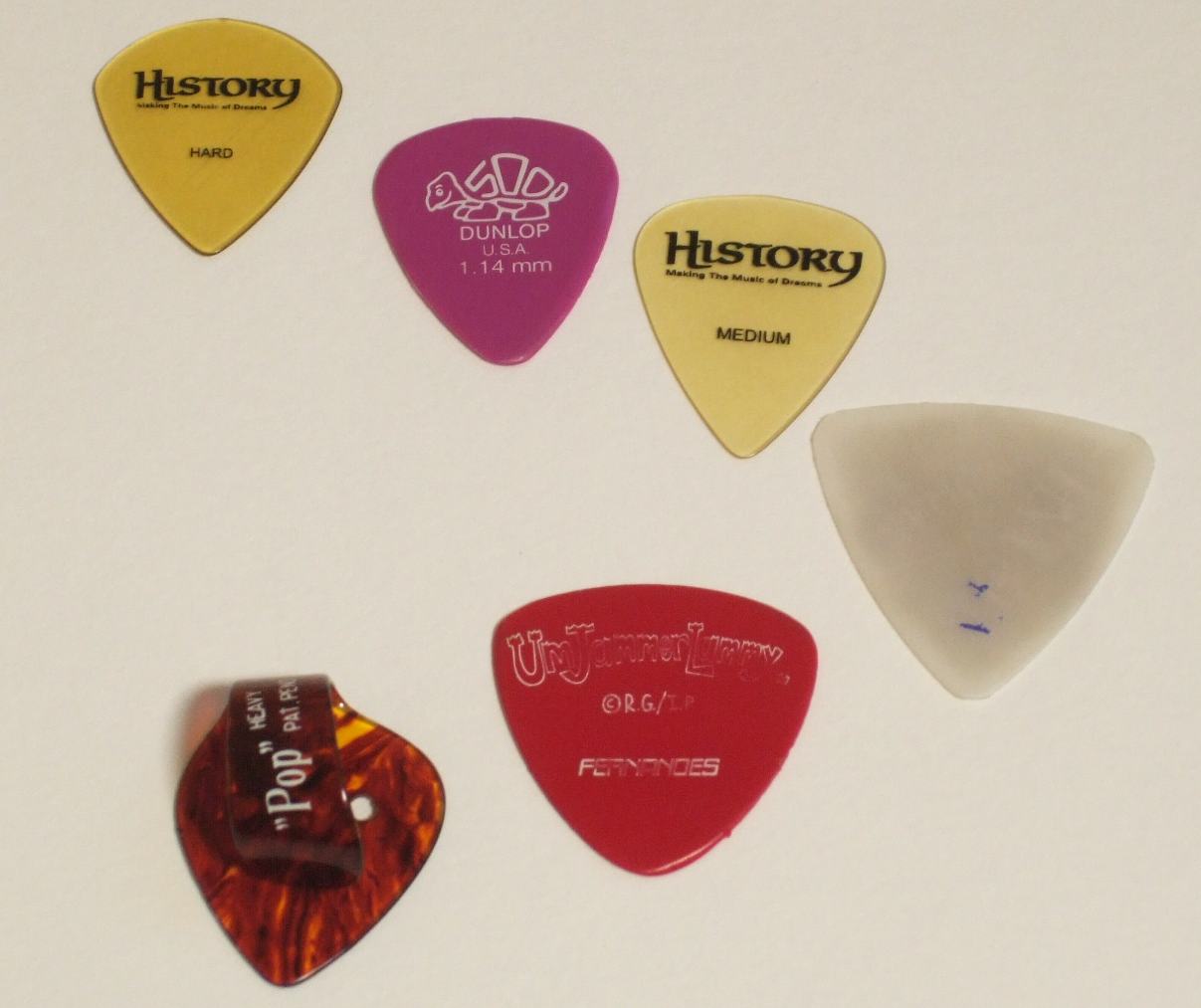 ---ピックによって本当に音は変わるのか?--- という疑問の答えを出すべく実験してみました( ̄▽ ̄) 実験方法は同じフレーズをピックを替えて演奏していきます。 って、そのまんまですねwww 選んだピックは下の写真の6枚。 1枚親指にはめるピックを使ってみました( ̄▽ ̄) 演奏は単音がいいか和音がいいかわからなかったのでとりあえずどっちも入れてます。 そして、演奏が一定していないので正確な比較にはならない・・・(;´Д`) 音作りについては、 いつもの感じでやらないと意味がない、と思いかなり歪ませた音となっています。 真上からの写真 左上から順に演奏 真横からの写真 上から順に演奏 1枚目:HISTORYのティアドロップ型ハード