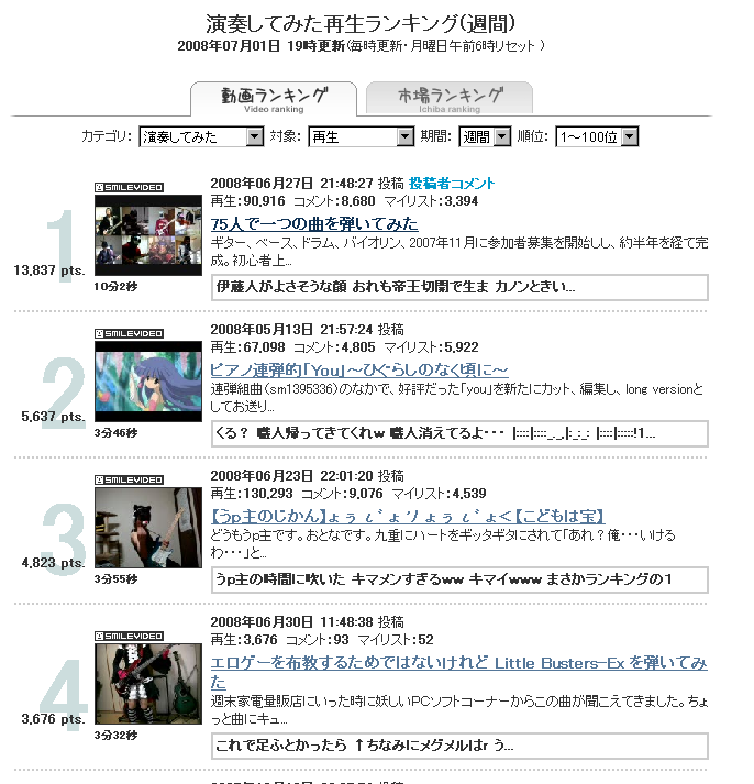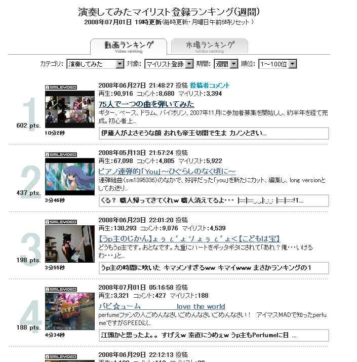 たった1日で3万再生、4千コメント、1千マイリスト登録。 ランキングを見てみると「演奏してみた」カテゴリでは再生数で第1位、コメント数で第1位、マイリスト登録数で第2位。 いい順位とったからといって賞金が出るわけではないし賞品が出るわけでもない。 だけれど、何にも代え難い勲章として単純にうれしい( ̄▽ ̄) 参加者全員が同じ気持ちだと思います(^^) 「なるべく多くの人に見てもらう」 という目標は既に達したとみてもいいのではないでしょうか(笑) もちろんもっともっと見てもらいたいですがっ(`・ω・´) 今度はワールドワイドな動画共有サイトYouTubeにアップしました。 ↑一応埋め込み方式で貼り付けましたがこの表示方法だと従来の低画質&モノラルでしか再生できません。 高画質&ステレオで再生するにはこの動画のYouTubeページに飛び、 右にある説明文のアドレスをクリックするか以下をクリック( ̄▽ ̄) Canon Rock performed by 75 people YouTubeのタイトル、説明文を英語に翻訳していただいたMiさん、ありがとうございますっ。 次は高解像度版の作業にとりかかりますっ(`・ω・´) ・・・これまたエラー頻発しそうな予感がする・・・( ´ー`) ※すみません、伊藤さん。二重に記事を投稿してしまったのでひとつ削除しまして、一緒にコメントも消えました。 アドレス抜け、申し訳ございませんm(_ _)m こらからアップするものにはアドレスつけておきますっ(`・ω・´) |