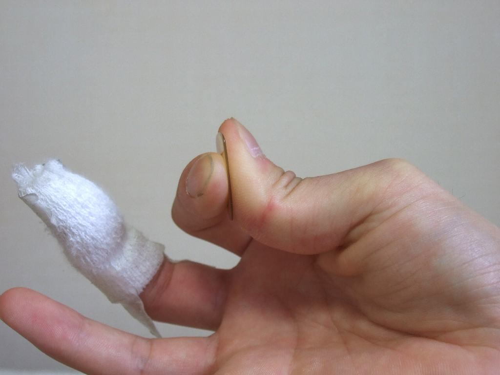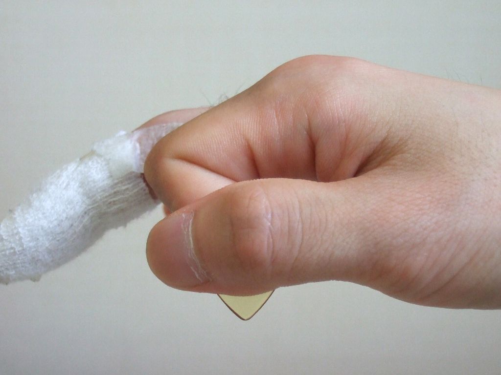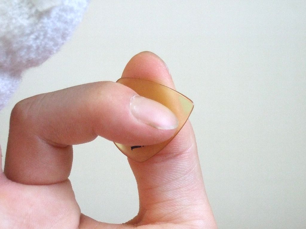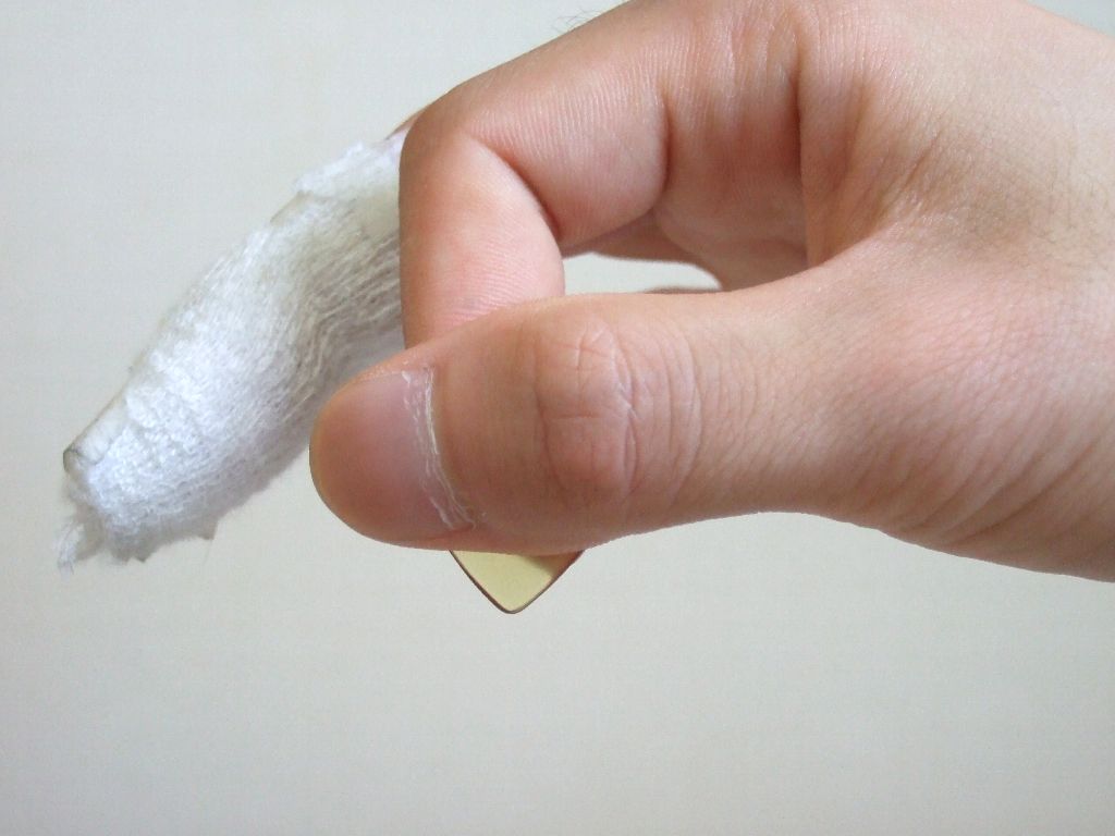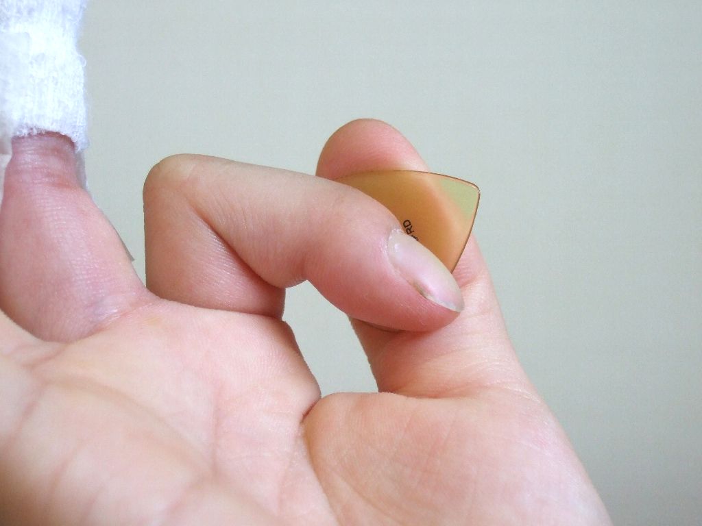 ならば改めて自分のピックの持ち方を見てみるとする。 まず私のピックの持ち方は最もポピュラーであるといわれる「順アングル」 親指を逆反りさせることが苦もなく可能なので「逆アングル」も可能だがなんとなく順アングルに落ち着いている。 逆アングルで弾いている人はあまり見かけないような気がする。 親指が逆に反る人が少ないのか?う~む( ̄~ ̄;) 余談だが私の家では4人中2人が逆反り可能。 ↓これくらいは楽に逆反る 私のピックの持ち方が悪いのかピッキングが悪いのかは不明だがピックを持っている人差し指の先端が弦に時々当たってしまう。 ダウンピッキングの場合はピックより先に指が当たっていることになるし、 アップピッキングの場合はピックで音を鳴らした直後に人差し指でミュートしてしまうことになる。 人差し指のしまい方が悪いのか・・・。 ↓こんな感じ↓ ↓裏返すとこう↓ 人差し指先端からピック先端までの距離がほんの数ミリしかない。 う~んこれで普通なのか・・・それとも・・・・。 ↓それともこう持つのかっ?↓ ↓裏側から↓ この持ち方かなり窮屈に感じる、が、こうでもしないと人差し指が邪魔でしょうがない・・・か( ̄~ ̄;) 弾くときはだいたいこの辺に手首を置く。 基本である「ピックのしなりを利用したピッキング」をするために今は1cmくらいピックを手から出すようにしている。 「ピックが弦に負ける」というのもこのほうが分かりやすい( ̄▽ ̄) この状態でピッキングする癖をつけるためにテンポ70くらで確実に丁寧に延々と単純フレーズを弾いている。 ・・・なんだか・・・ギター初めて2年経過してやっと本気で基礎練習しているような(笑) みんカノ2、80%ほど「音と映像の同期」が終わった。 あくまでタイミングを合わせただけ、分割構成などまるで出来ていないしまだまだ勝負はこれからだ(`・ω・´) 明日中には全ての同期を取り終え、画面分割の作業に入りたい。 そしてこれが相当悩みそうだ(笑) 8分割のときにリードはどこにするか?Lは?Rは?RRは? 分割数の関係上、単純にど真ん中リード、右にRとRR。左にLとLLってわけにもいかないのだ( ̄▽ ̄) GWだ! 4連休いただきっ! ズサ━━━━【4連休】⊂(゚Д゚⊂⌒`つ≡≡≡━━━━!! 会社の同僚「GWどっか行くんか?」 SupaSupa「いえ!どこにも行きません!(`・ω・´)」 って全力で答えた私はどうかと思うがな・・・。 弾きこもりと編集こもりで(`・ω・´)b |