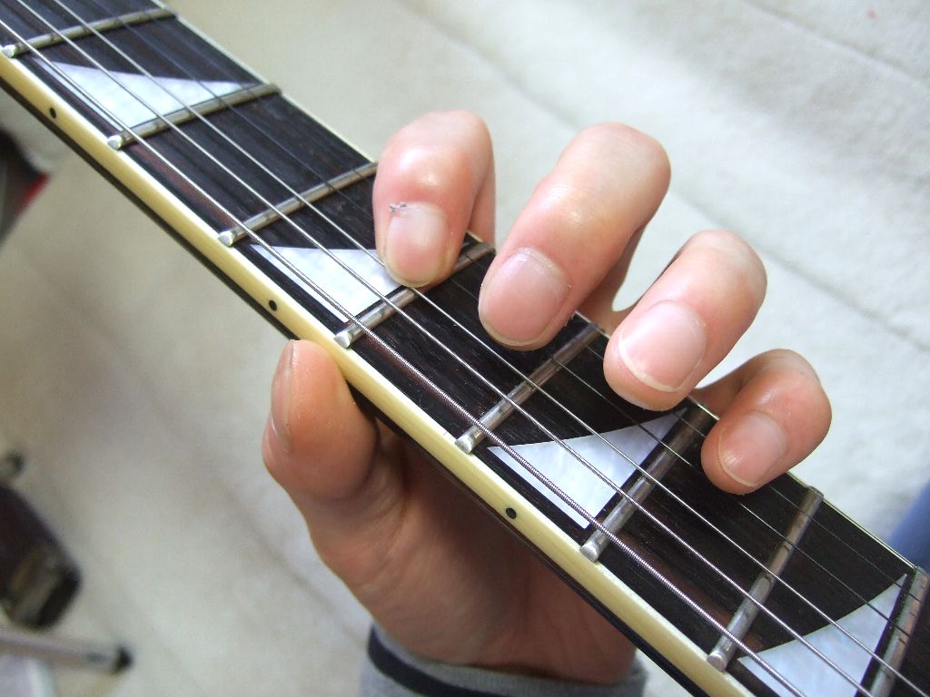 ここでいうミュートとはブリッジミュートでズンズン鳴らすアレではなくただ単に「消音」の意。 このブログですでに何回もネタとして使われたが基本に立ち返ると言うことで今回もまた登場してもらおう(笑) ギターにも地味な技、派手な技、たくさんの「技」といえるようなものがあるけれど、 こと「重要性」においてミュートはかなりの上位ランカーだと思う(`・ω・´) 例えばスウィープはその演奏箇所だけしかないけどミュートはどうだ?(=゚Д゚=) (ほぼ全部スウィープで構成されてる曲もあるが) ミュート技術は最初から最後まで全編に渡って必要。 ギター始めたときに鳴らす音だけに注目して慣らさない音を意識してなかったら・・・ 大変なことにっ! m9っ`Д´) 変なクセついちゃってもう大変Σ(゚д゚lll) 左手右手を最大限活用して無駄な音は消す!イレース!デリート! 弾く弦より低音弦は右手の手刀部分でミュート、 高音弦側は左の手のひらや指を使ってミュート。 ・・・・が基本でいいの・・・か?(;´Д`) とはいっても弾く弦の隣を手刀ミュートするのは結構難しい。 ちょっと位置が狂ってると鳴らす弦までミュートorミュート出来ずにノイズ封印解除(笑) そういうときは左手の人差し指、その先端でちょこっと触れてミュートするそうだ。 「指は立てて押弦」という基本ルールからは少々逸脱するがケースバイケースということだろう( ̄▽ ̄) ここ2、3日、ピッキングの基本を体に染みこませると同時にこの人差し指ミュートにちょうど良さそうな単純フレーズを延々と弾いている。 |--------------------------- |--------------------------- |--------5-----------5------ |--5-6-8---8-6-5-6-8---8-6-5 |--------------------------- |--------------------------- ※このテキストTABはこのサイトを使用。ちょっとだけTABを書くときに便利。 mixiの速弾きコミュでたまたま見かけたフレーズ。 これをクリーンセッティングとディストーションセッティングで練習。 クリーンセッティングではピッキングの正確性などがチェックでき、 ディストーションセッティングではミュートのチェックが出来る。 ミュートを意識していないとき568と弾いて3弦の5に移ったとき4弦の解放が鳴る。 ちょっとの歪みではあまり目立たないが過激な歪みにすると鳴る鳴る(笑) 4弦の8を離弦するときに小指を弦に触れたままでもいいが(弦をフレットの接触から離しはするものの小指自体は弦から離さない) それはかなり難しい。 それよりは3弦5を押弦したときにいっしょに4弦に触れてミュートしたほうが容易い。 ・・・何、どっちも活用しろ? い・・・イエッサー(>Д<)ゝ” 動画を撮ってみた。 デジカメの動画機能はビデオカメラと違って取り込みや準備の手間が非常に少なくていい!(*´д`*) 最近のデジカメはメモリーカードの容量さえ確保すればビデオカメラの画質と大差ないしねぇ( ̄▽ ̄) ギターと関係ないけどもう少しデジカメの話を・・・撮影機材はフジフィルムのFinePix F31fd 個人的にフジのFシリーズはおすすめ♪ この動画で人差し指の先っちょでちょっとだけ4弦に触れているのがわかる・・・って!わかりにくいな!(笑) よ、よし!写真だ! ・・・そんな感じ( ̄▽ ̄) おおっと書き忘れるところだった∑(=゚ω゚=;) !! 動画はライン録音無し、アンプすら繋いで無し、デジカメのマイク直。 思いつきで録画しただけだからこうなった( ̄▽ ̄) 昨日今日とブログ初期~中期のような記事が書けたなぁ・・・懐かしい(笑) みんカノ2、ギターパート全部の同期が終了。 これから分割の構成を考えその構成プリセットの作成に入るであります!(>Д<)ゝ” 動画のサイズが640x480、720x480、848x480、320x240、などがあるからその数のぶんだけプリセットが必要になりさらに、 横幅のカットも必要だからこれまた時間がかかりそうだ(^^;) |