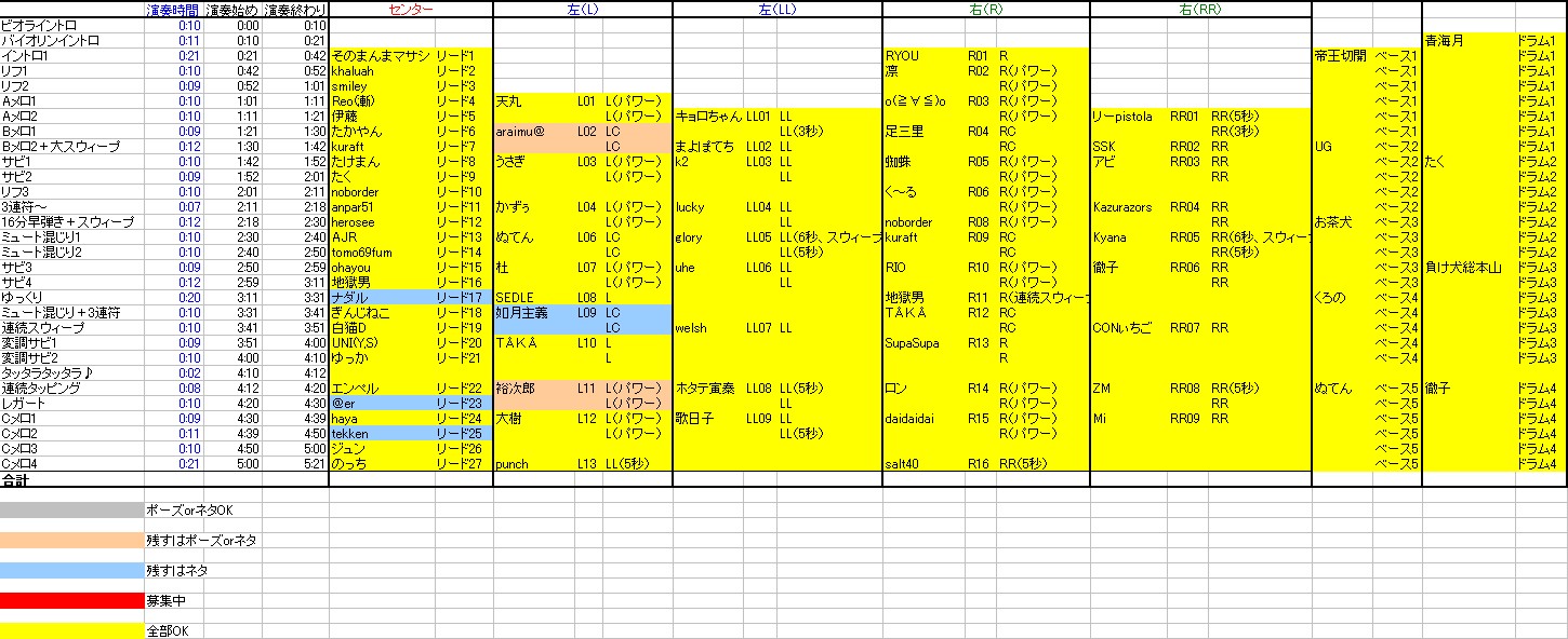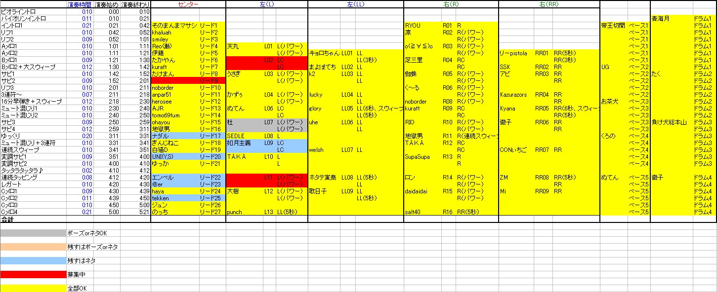 再募集、再々募集しても結局音沙汰無しなどで不参加。 もうそろそろホントに進もうじゃないか・・・。 というわけで空いた3枠の最終募集。 ↓の表をごらんくださいませ( ̄▽ ̄) (クリックで拡大) 赤く塗りつぶした枠が3つあります。 この3枠が募集枠です。 募集方法ですが、今までの方法とは違います。 ・希望者は希望枠パートを演奏した動画と音声(ギター音のみ)をファイルバンクにアップ。 ・私が確認して耳コピミスなどがなければ決定。二人以上が同じ枠を選んだときは顔出しや画質音質、演奏で判断。 ・決定したかたはメロイックサインとネタをあとからアップ。 というやりかたでいこうと思います。 みんカノ第一弾にすでに参加したかたでも第二弾に参加している方でもOK。 つまりだれでもOK。 これでも担当者が決まらなかった場合は私が左手だけで弾くかギター仲間のどなたかにお願いしようと思います。 |