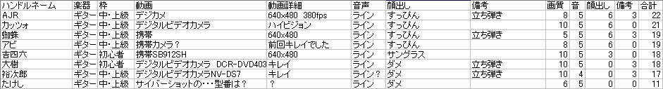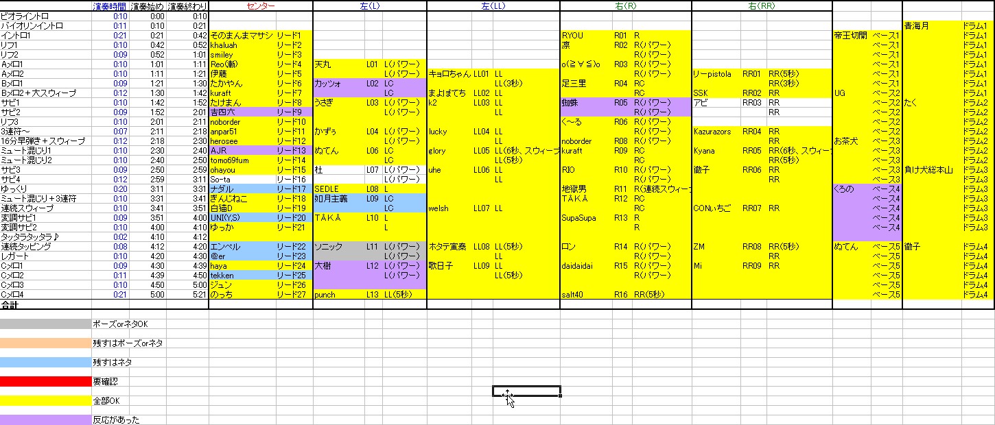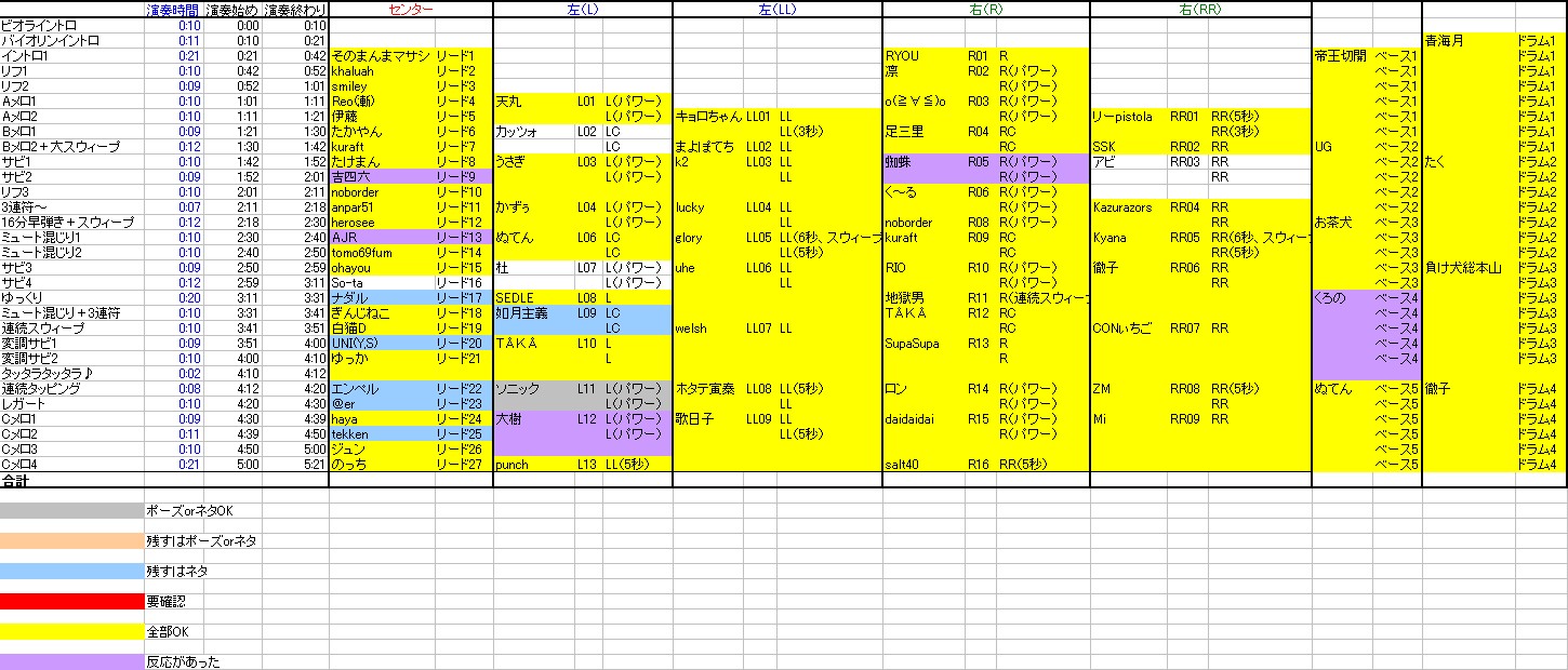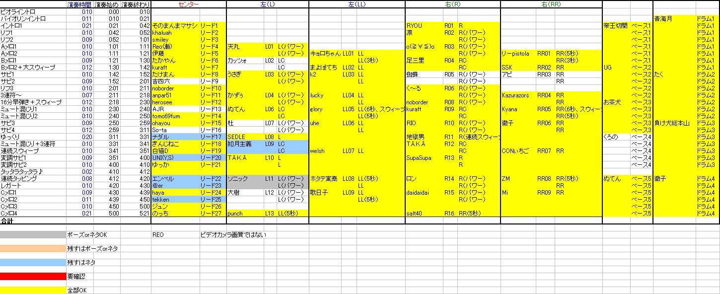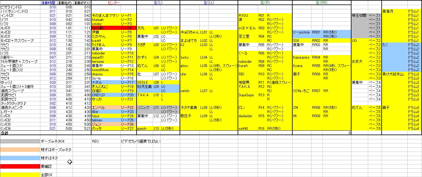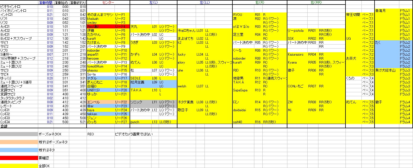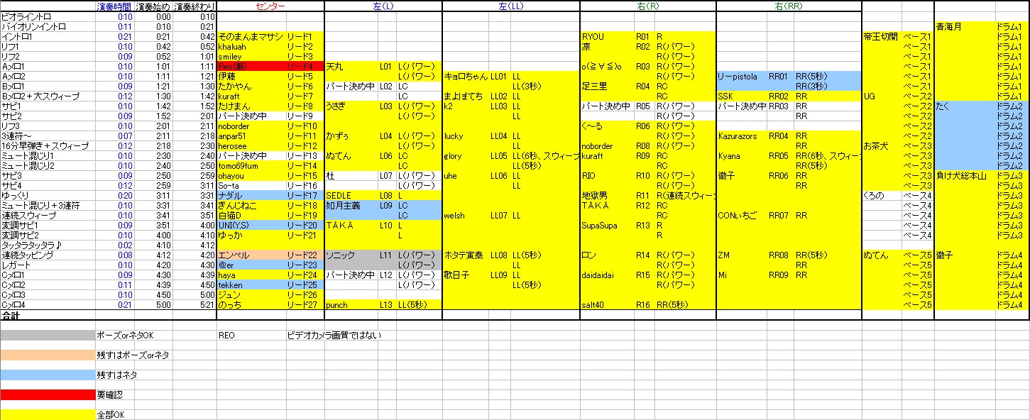 希望される方はこちらの記事へ 連絡無しにより除名されたギターパート、再募集をかけていたわけですがパートはともかく誰が参加するかは決定しました。 募集中のギターパートは6つ。 当然ポイントが高い人が当選、希望のパートも優先されます。 この表のとおり、 AJRさん カッツォさん 蜘蛛さん アビさん 吉四六さん 大樹さん の6人に決定しました。 さっそく希望パートをこちらの記事からメールフォームで送ってください。 上記の記事をよく読んで例のとおりに送ってください。 書き方を間違うとで残り物のパートになります。 今週の日曜までにメールが届かない場合は除名。 希望パートとして書くのは当然上の表にある「募集中」のところだけです。 耳コピミス等で再提出となっているかた(杜さん、ソニックさん)もお早めにお願いいたします。 Reoさん、高画質取り込みが難しそうでしたら、もう前回アップされたものでいきましょうか? So-taさん、一度メールをいただきましたがその後どうでしょうか? そろそろ提出をお願いいたします。 ジュンさん、エンペルさん ネタは必須ではありませんがポーズが提出されておりません。 お早めにお願いします。 その他、ネタを提出されていないかたがた、必須ではありませんがなるべくお願いいたします( ̄▽ ̄) 最初の締め切りからそろそろ1ヶ月。 早く全てのファイルを揃えたいのでご協力のほどよろしくお願いいたしますm(_ _)m ImaginatBlowGIG 2008ライブ直前の会場 ビデオカメラから映像取り込みの作業をしてたらついついそのままずっと見続けてしまう(笑) あれだ、本を片づけてたらつい開いてしまいそのまま何時間も読んでしまうアレと一緒(^_^;) |
