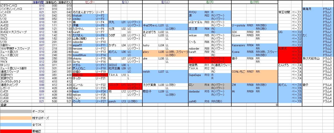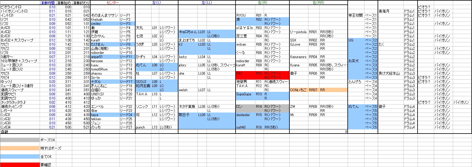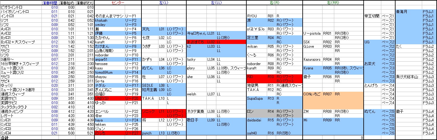 ダウンロードしたものから順次チェックしていってるんですが予想より時間がかかりそうです。 個人がファイルバンクのファイルをダウンロードしてみんカノ2公開よりも先に見てしまうと楽しみが減りますので、 私がダウンロードしたものはファイルバンクから削除していきますのでご了承くださいませ( ̄▽ ̄) ファイルを残しておくと、今からアップする人が「あ、こういうファイル名にすればいいんだな」というテンプレになるという利点もあったのですが(^_^;) そのテンプレは以前の記事に書いたし、ここにも書くことで対応することにしよう(`・ω・´) 「SupaSupa」リード1.avi 「SupaSupa」ポーズ.avi 「SupaSupa」リード1.wav というようなファイル名でアップしてください。 下の表が中間報告です。クリックして拡大。 RIOさん 320x240のwmvになってしまっています。 RIOさんがお持ちのデジタルビデオカメラなら720x480のAVIでPCに取り込めるはずです。 取り込み時にはなんのソフトを使っていますでしょうか、ムービーメーカー? どうせ撮り直すのなら・・・ちょっと修正箇所があります。 耳コピが少々違うのです、このパワーコードはリフをただ簡略化しただけではなく、ちょっと違うのです、じっくりと聴いてみてくださいませ。 Canon RockバンドバージョンとかのTABは正確ではありません。あくまで耳で(`・ω・´)b 今のところ、耳コピパートのかたの約半数のかたが間違って耳コピしています。 間違っているかた全員に撮り直しをしていただくと大変なことになるので少々の耳コピミスは流していこうと思います(^_^;) 今日は作業はここまで。 続きはまた明日やることにしよう(`・ω・´) あ、最後に、 ---本番前にチューニングをお忘れ無く--- |