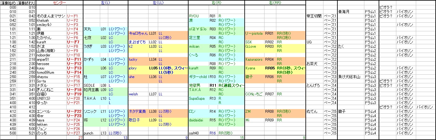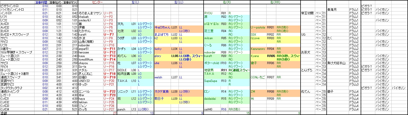 最終決定パート分け表 というようになりました。 何かミスがあったら教えてくださいませ(^^;) TÅKÅさんが全パートを耳コピしたTABを作成されました、ありがとうございますm(__)m ここに置いておきますので参考にしてください。 本人曰く、「結構大雑把にコピったのであくまで参考程度に」とのことなのでTABの全部を鵜呑みにしないようにお願いします。 あくまで参考程度に。 それから、掲示板にパート確認目的のスレッドを作成しましたのでそちらでもお互い協力しあっていただければと思います。 今回も動画の冒頭、全員で何かポーズをとるなりしようと考えてます( ̄▽ ̄) イントロ中は無理なので曲が始まる前。 ここでそんなに時間をダラダラととりたくないので10秒程度で全員映る感じで。 一人一人映すとなると・・・一人分の時間が0.1~0.2秒しかないので何人か同時に映す方式になると思います(前回は4人同時)。 ひとつ考えているのは手拍子。 テンポをあらかじめ決めておいてそのテンポで手拍子をしてもらう。 手拍子に合わせて画面を切り替えて全員を映していく。 ときどき合間に文字を入れたり。 最後の一回は全員が映るとかw(約80分割、一人一人の画面ちっさい!見えない!) Stickamライブ映像その2 @erさん~さぼさん~Kyanaさん(演奏直前) 279MBもあるけどダウンロードしますか? |