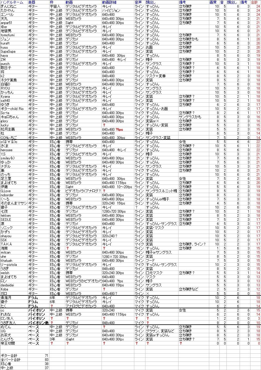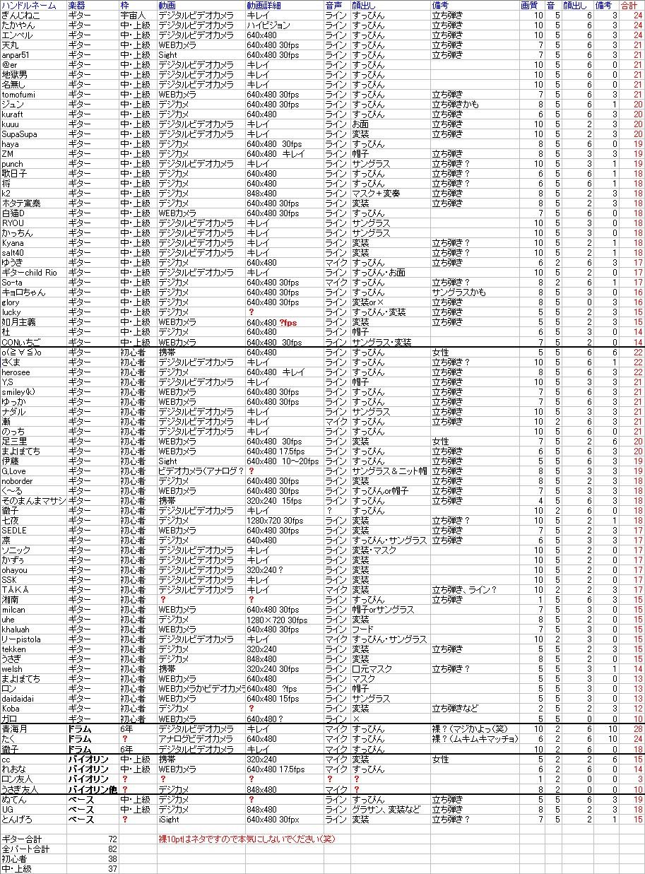 追加しましたのでドラムのパート分けが変更になっています。 申し訳ございませんがドラムのかた、もう一度メールをお願いいたしますm(__)m 負け犬総本山さん、申し訳ございませんでしたm(__)m だいたいぱっと見、全参加者の8割くらいからメールが届いたような気がします( ̄▽ ̄) まだパート希望メールをいただいてないかた一覧(フライング無効を含む)敬称略 &パート変更によりドラムのかたがた全員 たかやん @er のっち kuuu 白猫D かっちん く~る ソニック SSK 如月主義 milcan uhe リーpistola ロン Koba ガロ たく UG とんげろ 負け犬総本山 青海月 徹子 たく 届いたけれど書き方に不備があるかた一覧 伊藤 ゆうき daidaidai 帝王切開 パート希望メールを受付中です。 こちらの記事をよく読み書き方の例にならってその記事中にあるメールフォームからメールを送ってください。 遅くなればなるほど不利になりますのでご注意を。 例えばこんな感じの不備がありました 第一希望 リード1 第二希望 リード2 第三希望 リフ ・・・っなんでやねんっw┌(`Д´)ノ)゚∀゚ )! 第二希望までちゃんと書けてるのに第三希望でいきなり曖昧になってる(;´Д`) |