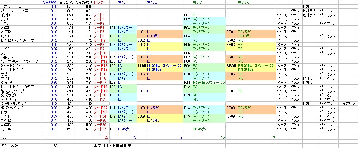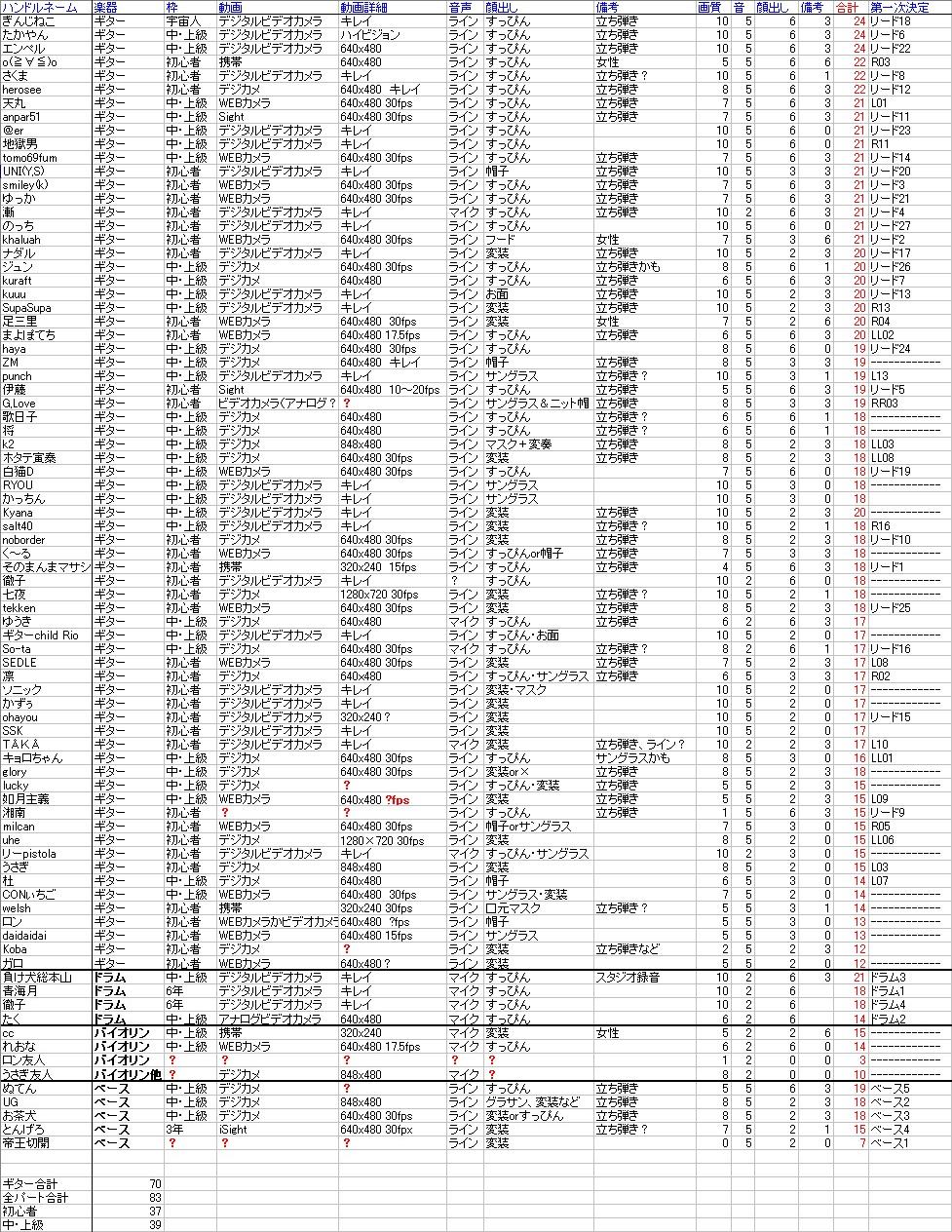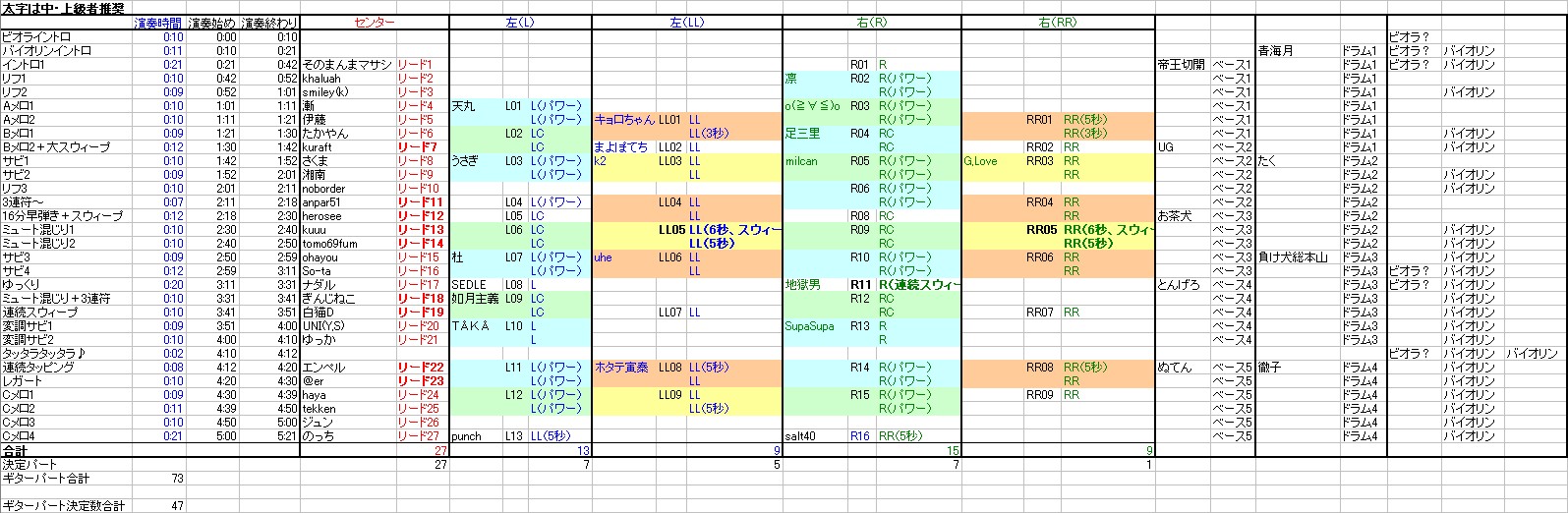 参加者一覧表 パート分け表 パート分け表にL01やRR03などの記号をつけたので、 「1:01~1:11のL(パワー)を希望」 とかではなく、 「L01を希望」と簡単に書けます(^^) そういえば、 初心者とそれ以外のかたが偏らないようににわざわざ初心者枠と中・上級枠を設けましたがちょうど同じくらいの人数になったのでこれはこれで良しとします(笑) ではコメントに希望パートをを書いてもらう・・・・・と、思ったんですがっ! 「ポイント合計が高いかたから優先して決める」 となると・・・・・・・。 ポイントが高い人から希望書き込んでもらわないとダメじゃん(;´Д`) 10ptの人「リード2希望します~」 ---翌日--- 20ptの人「私もリード2希望します~」 ↓ 10ptの人、落選。 これじゃ今日一斉にパート希望聞いたところで意味なっしんぐ(^^;) かといってポイント高い人から書き込んでもらうと非常に時間がかかる。 ・・・・・・どうしよう・・・・( ̄~ ̄;) う~~ん・・・・( ̄~ ̄;) ・・・よし! ではこういうのはどうだろうか。 やっぱり今日から一斉にパート希望をとる。 ただし、メールフォームから希望を送ってもらう。 コメントに書くと遠慮とか絶対すると思うし。 例えば--- 10ptの人「R01希望」 ---1時間後--- 20ptの人「(R01希望だったんだけど・・・もう希望者いるなぁ。)じゃ、R02希望にしようかな」 これだと結局早い者勝ちでポイントの意味なし。 ポイントのためにがんばって立ち弾きしようとしたりすっぴんで出たりする人もいるだろうからポイントの意味はなくしたくない。 そこで、メールフォームからメールを私に送ってもらう。 第3希望まで書いてもらい、数日後に第一次パート決定。 そこで決定したパートはもう変動せず、メールを送らなかった人、第3希望まで書いても希望通りにいかずにあぶれた人は残りのパートだけで選ぶ。 厳しいようだけど「ポイント制」なんだもの(^^;) ベースパートなんですが、これはドラムの音を聴いてから弾いたほうがよいとのことなのでまずドラム録音してからになります。 かといってドラムのかた、焦って録音しなくてもOKでございます(^^;) じっくり練習してからで(^^) バイオリンパートはパート決めが難しいですね(^^;) タッタラタッタラの部分は和音、つまりそれぞれの音を決めて全員弾いていただきたいところです。 何和音なんだあそこは・・・私の耳には二つの音しか聞こえないが(^^;) すみませんがバイオリン、ビオラ?チェロ?等の楽器についてはよくわかりませんのでそれぞれで相談して決めていただきたいと思ってます(^^;) 相談にはこの記事のコメントをご利用くださいませm(_ _)m もしくはコメントで待ち合わせ時間を決めてこの記事の「チャットはこちら」に作ったチャットでリアルタイムに相談することも出来ます。 さらにもしくはこのブログに左上に私のStickamを貼っておきますので私がStickamを起動させていればそこのチャットでもOKです。 ぅあ~、ややこしいだろうと思います。実際私もややこしいです(^^;)。 ・・・・・・、 と、いう感じでどうでしょうか? OKなら明日からメール募集しますし、何か他にいい案があればコメントへおねがいしますm(_ _)m 記事書いて1時間後くらいに追記 ちょっ・・・と待ったぁあ! もうメール来てるし(笑) しかも私の話伝わってないし _| ̄|○ 例えばこんな感じ↓ 第一希望 リフ1 第二希望 リフ2 第三希望 リフ3 ・・・・それはいったいリード?サイド?('A`) 例えばこんな感じ↓ ゆっくりか一番最後のパートで。 ・・・それはいったいどこのことでしょうか?そしてリード?サイド?('A`) あと、第3希望まで書いてくださいませ?('A`) こんな感じで書いてくださいませ↓ m(_ _)m 第1希望 リード15 第2希望 RR02 第3希望 L12 でもまだメールは受け付けてないので、もうちょっと待ってください(^^;) |