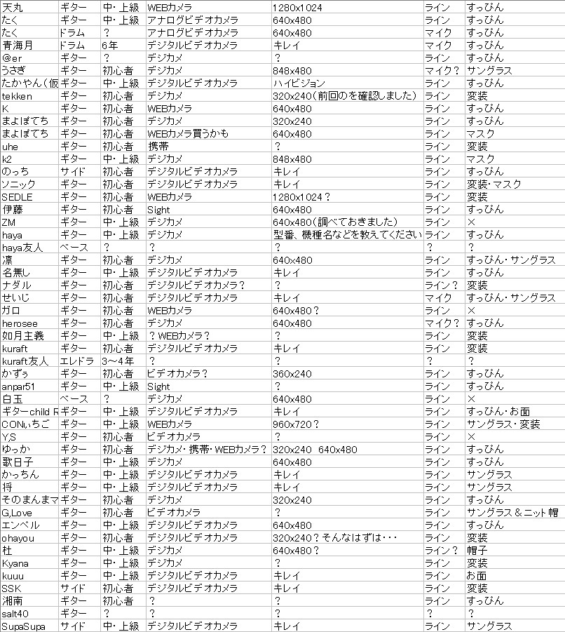 参加者希望者の方は目を通して、間違いがあったなら教えてください。 解像度などに 「?」 がついているのはまだわからない、あやふやです。 のちのちに付ける予定のポイントが0になりますので落選の可能性が高くなります。 そのまま放って置くと、大変なことになりますよ・・・(TV・本当は怖い家庭の医学ふうに) ポイントというのは、例えば デジタルビデオカメラは10P デジカメで640x480は5P すっぴんで10P 変装で4P というようにポイントをあらかじめ決めておいてそのポイント合計の高い順から当選。 というようにしたいと思っているのです。 これなら私情を挟まずに公平に選べますから( ̄▽ ̄) 演奏レベルはすでに枠で分けてあるので問題なし。 んで途中経過がこれです。元になっているのは参加希望者正式募集の記事 そうそう、WEBカメラのかたはフレームレートも教えてください。 解像度高くてもカクカクの動きだとちょっと・・・な感じなので(^_^;) 分からない場合はファイルバンクに何かサンプル(動くもの)を撮ってみてアップしてください。 ドラム・ベース等も人数で割って演奏します。 って、まだ人数少なすぎ(^_^;) 求む!ギター以外の奏者! そして案の定、ヴァイオリン奏者とかはなかなかいないですねぇ(^_^;) 知り合いにそういう奏者がいましたら声をかけてみてください( ̄▽ ̄) 東京観光レポートやらライブレポートやらもやりたいけど、言い出しっぺの私がこの企画をほったらかすわけにはいかない(`・ω・´) レポートは落ち着いてからやろう、うん( ̄▽ ̄) |