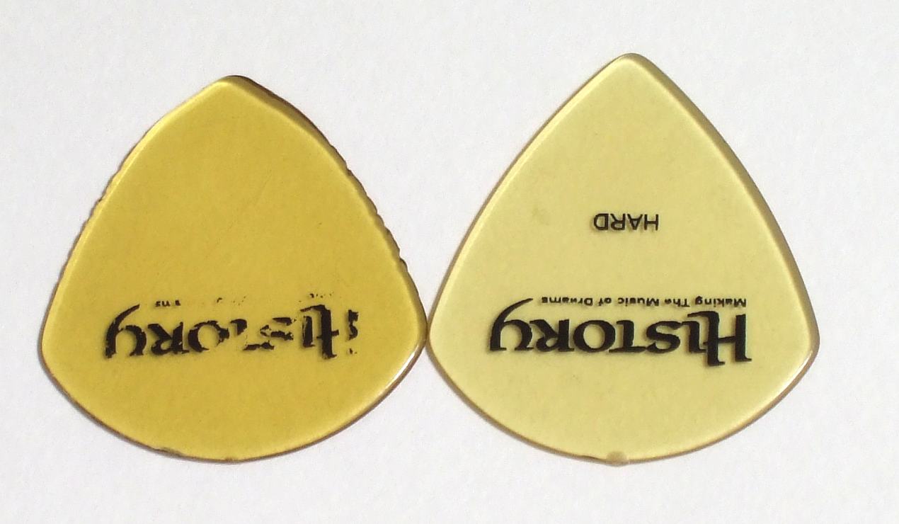 今日なんて「ギター 地獄トレ」「ギター動画」「買い物」とかに当てはまるし。 比重の高そうなギター動画にとりあえずはしてみた( ̄▽ ̄) 今日は来週の東京行きに向けて服を買いにお出かけ。 今着てるのはもう色あせてるしだぶだぶでかっこ悪いのでいっちょカッコイイ奴を買おうと思っていたのだ( ̄▽ ̄) 何店か回って結局ブルゾンという種類の服を買った。 「ブルゾン」の定義ってよくわからないがw たぶん、あれだ。 えりがこう・・・丸っぽいの。あれがおそらくブルゾンというものだろう( ̄▽ ̄) ・・・って全然違うじゃないか(;´Д`) あとは2枚重ねふうになってるレイヤードシャツとかいうものを1枚。 う~ん結構高いのね(^_^;) でもトータルでだいぶナウい感じになったから良しとする♪ 楽器店でピックを5枚購入。 お気に入りのピックを4枚、同じ形のもっと硬いものを1枚。 普段はハードを使っているけどエクストラハードというもっと硬いのがあったのに今まで気付いていなかった(笑) で、新しいの買って気付いたのだけれど今まで使ってたピック、結構ちびてたみたい(^_^;) 左が古いピック右が新しいピック 重ねるとこんな感じ 側面の小さなミゾはピックスクラッチ(ひょろり庵さんのページ)で付いた傷かな( ̄~ ̄;) エクストラハードを使ってみたところ結構使いやすい( ̄▽ ̄) これはなかなかいいかもしれない。 そのエクストラハードで色々練習動画
