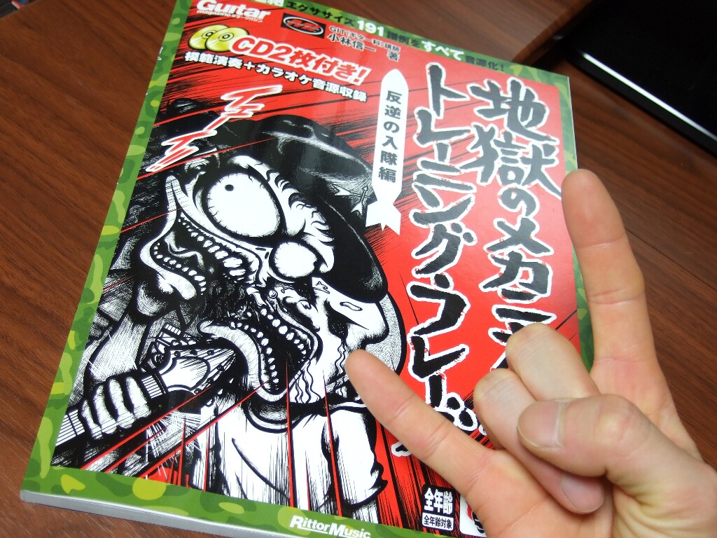 といっても記事にするのが久しぶりなだけで練習はほぼ毎日地獄ってる( ̄▽ ̄) 今日は地獄のメカニカル・トレーニング・フレーズ(反逆の入隊編)の梅総合練習曲。そう、梅である。 今まで地獄のメカニカル・トレーニング・フレーズには通常フレーズの他に松竹梅の三段階に分けて練習フレーズが載っていた。 今回は総合練習曲まで松竹梅の三段階なのだ(`・ω・´) 反逆の入隊編に書かれているのだけど、地獄ギターシリーズは今回のを含めて6冊発売済み。そのなかに総合練習曲は18曲。著者、小林信一いわく、総合練習曲難易度ランキング1位は第1作の『地獄より愛を込めて』。 そして18位がこの『始発より愛を込めて』つまり、一番簡単。だって梅だもの。 「じゃあ私にもすぐに弾けるんじゃね?」 と思って今日練習してみた。 相変わらず覚えるのに時間がかかる・・・(*´・ω・`) 半分くらいうろ覚えできたから(それは覚えてるとはいえないな)そこまでを久々に音源アップ。 地獄のメカニカル・トレーニング・フレーズ 反逆の入隊編 梅総合練習曲 『始発より愛を込めて』テンポ160(オリジナルテンポ) 久々すぎてちゃんとアップ出来てるかどうかも不安だよ!(笑) 模範演奏のビブラートが揺れ幅が大きくてカッコ良かったのでなるべくマネをしてみた(〃▽〃) リズム感が悪いのはいつものこととして・・・いや諦めてるわけではないのだが。 テンポ160の3連符が弾けてない(TωT) 説得力が全くないけど、あえて!あ・え・て・言・お・う! これは簡単。 地獄ファンで「総合練習曲を一曲でも弾いてみたい」と思っているかたにはおすすめ( ̄▽ ̄) |